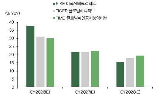 설 연구원은 “AI 액티브 ETF 중에서는 올해 성장 측면에서 미국 테크 비중이 높은 상품이 강점을 보이고 있다”며 “반면 2028년 이후에는 글로벌 AI 생태계 전반을 포괄하는 액티브 ETF의 성장성이 더욱 두드러질 것”이라고 전망했다.
